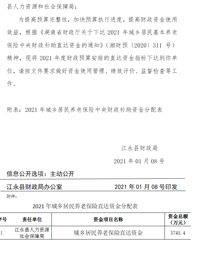 关于下达2021年城乡居民基本养老保险中央财政补助直达资金的通知江永财发〔2021〕11号