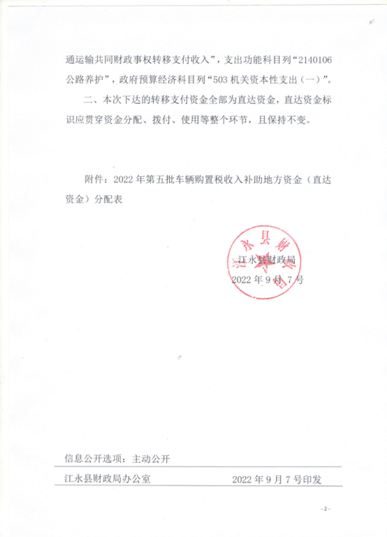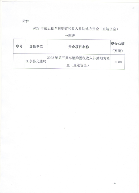 关于下达2022年第五批车辆购置税收入补助地方资金(直达资金)的通知