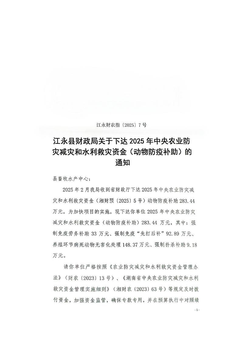 优米体育足球财政局关于下达2025年中央农业防灾减灾和水利救灾资金(动物防疫补助)的通知(江永财农指[2025]7号文件)