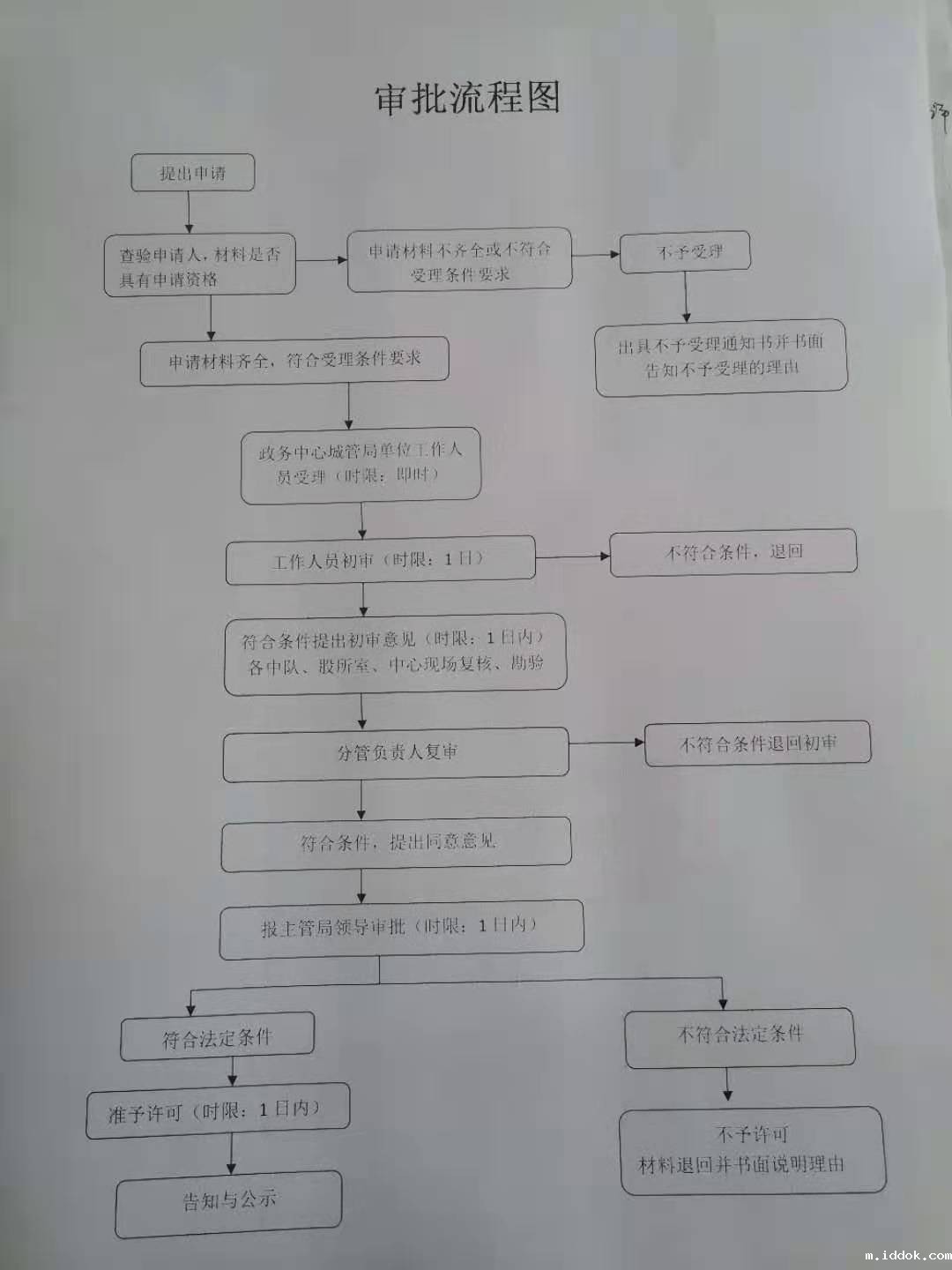 1.提交申请; 2.查验申请人,材料是否齐全或符合条件,不符合就不予受理,符合条件及时受理; 3.初审并提出初审意见;4.分管负责人复审并提出意见; 5.主管局领导审批,符合准予许可,不符合不予许可。 |