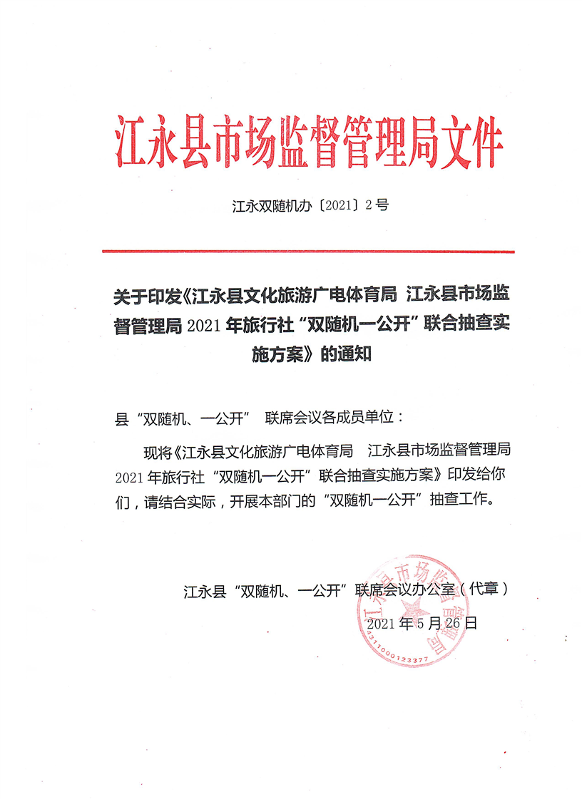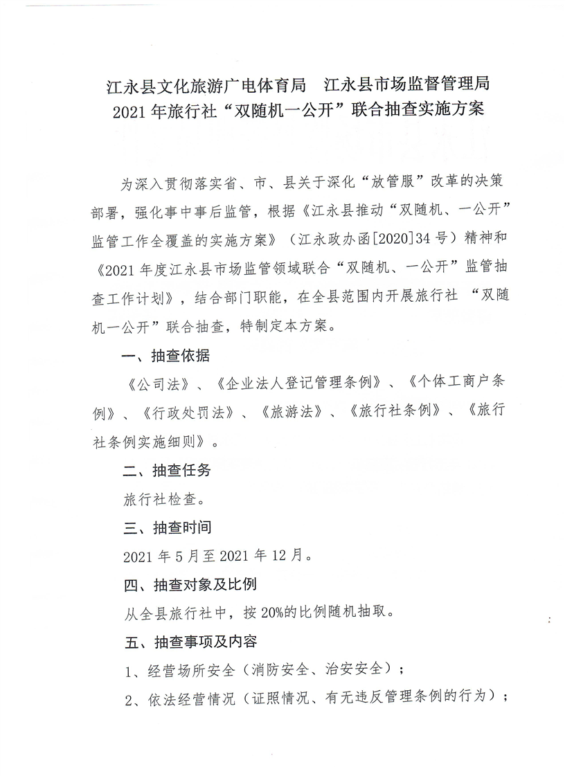 优米体育足球文化旅游广电体育局 优米体育足球市场监督管理局2021年旅行社“双随机、一公开”联合抽查实施方案
