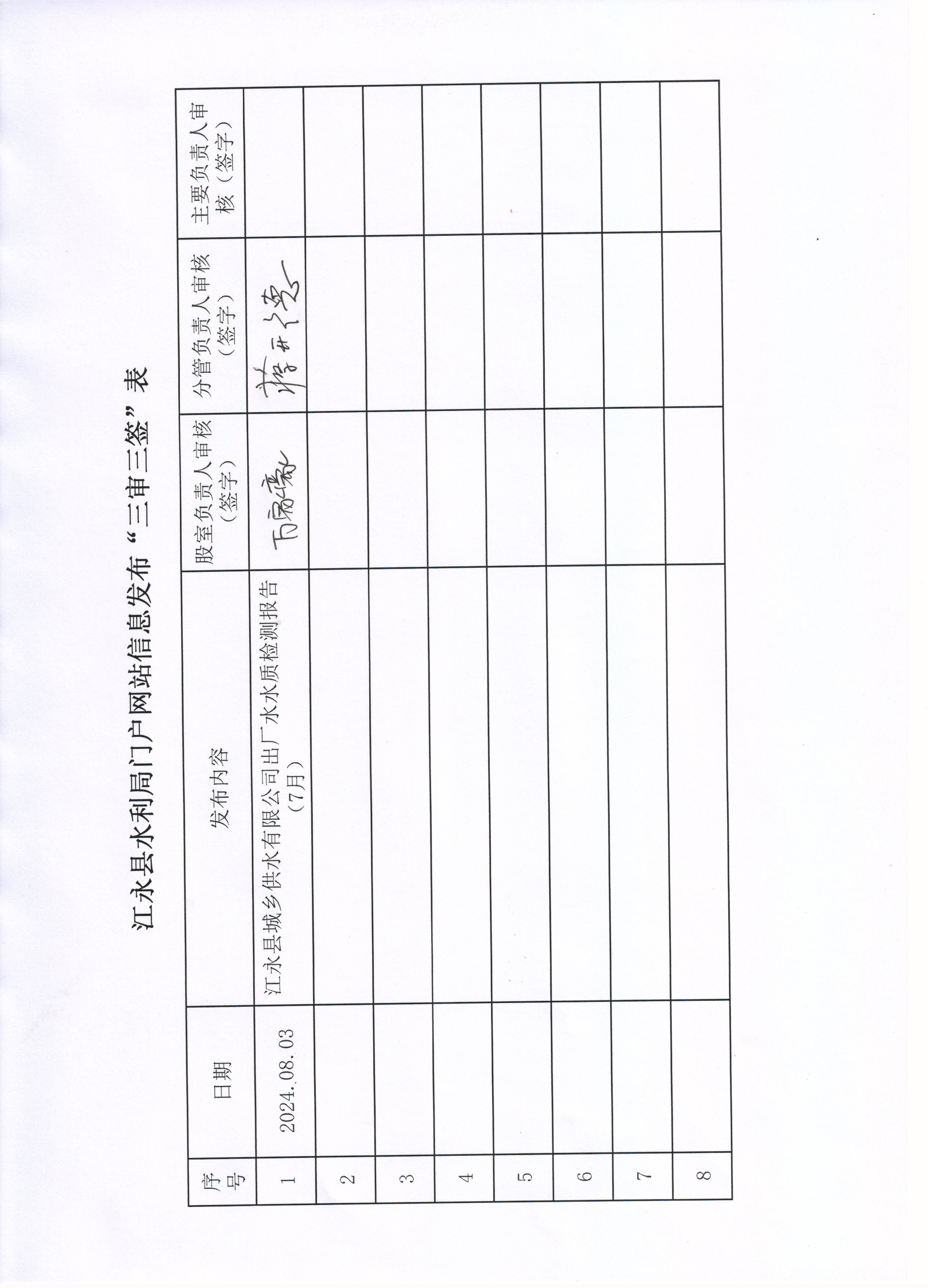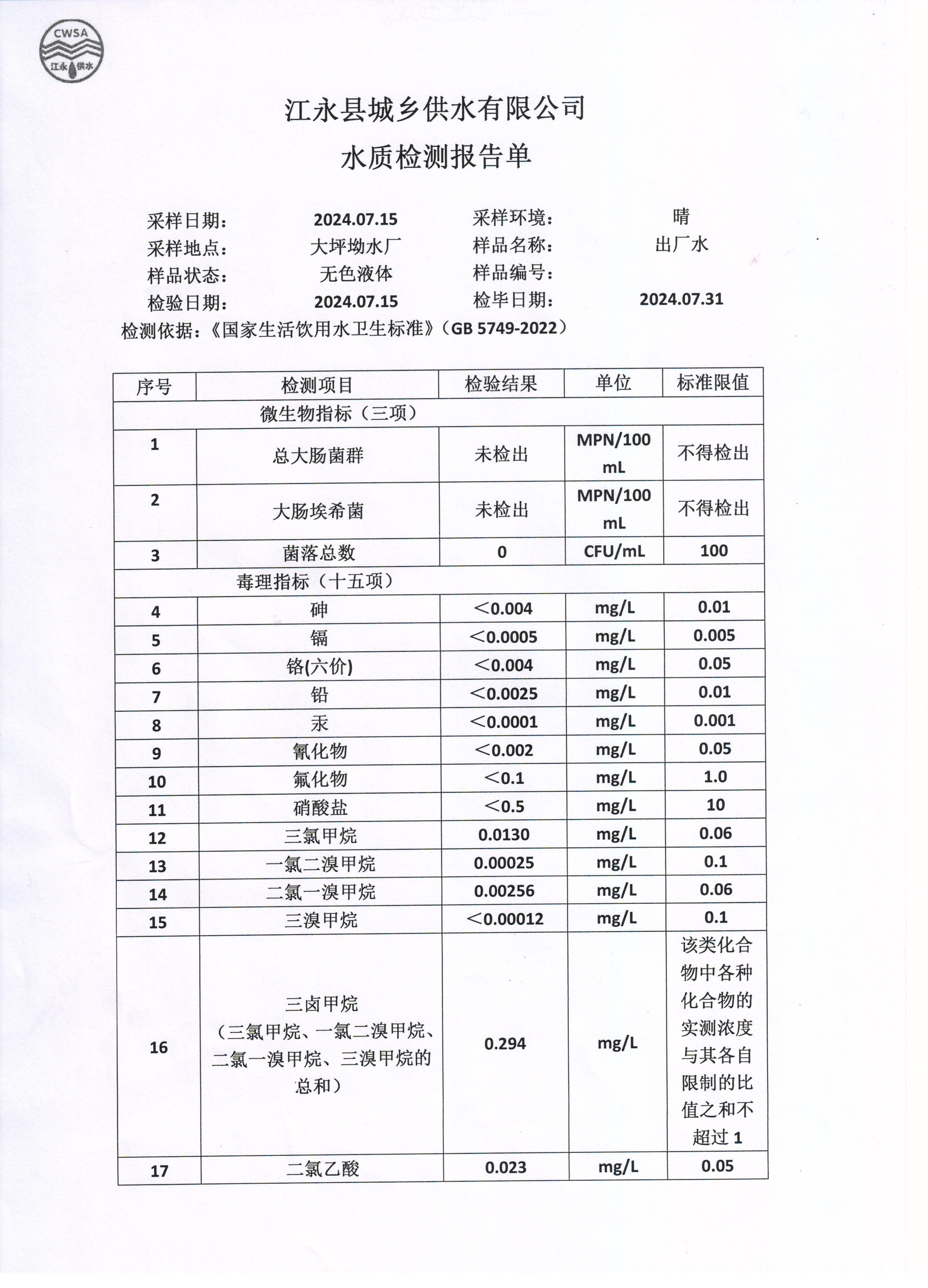 2024年优米体育足球城乡供水事务中心出厂水质检测报告单(7月)